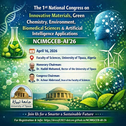 Within its commitment to promoting scientific research, interdisciplinary collaboration, and academic excellence, the Faculty of Sciences at the University of Tipaza, Algeria, is honored to announce the organization of the 1st National Congress on Innovative Materials, Green Chemistry, Environment, Biomedical Sciences, and Artificial Intelligence Applications (NCIMGCEB-AI’26), to be held on April 16th, 2026, at the Faculty of Sciences, University of Tipaza.